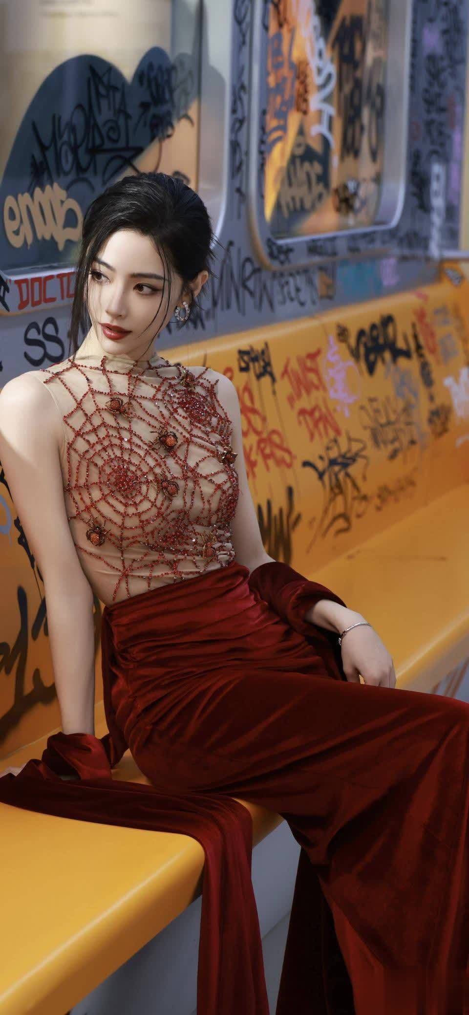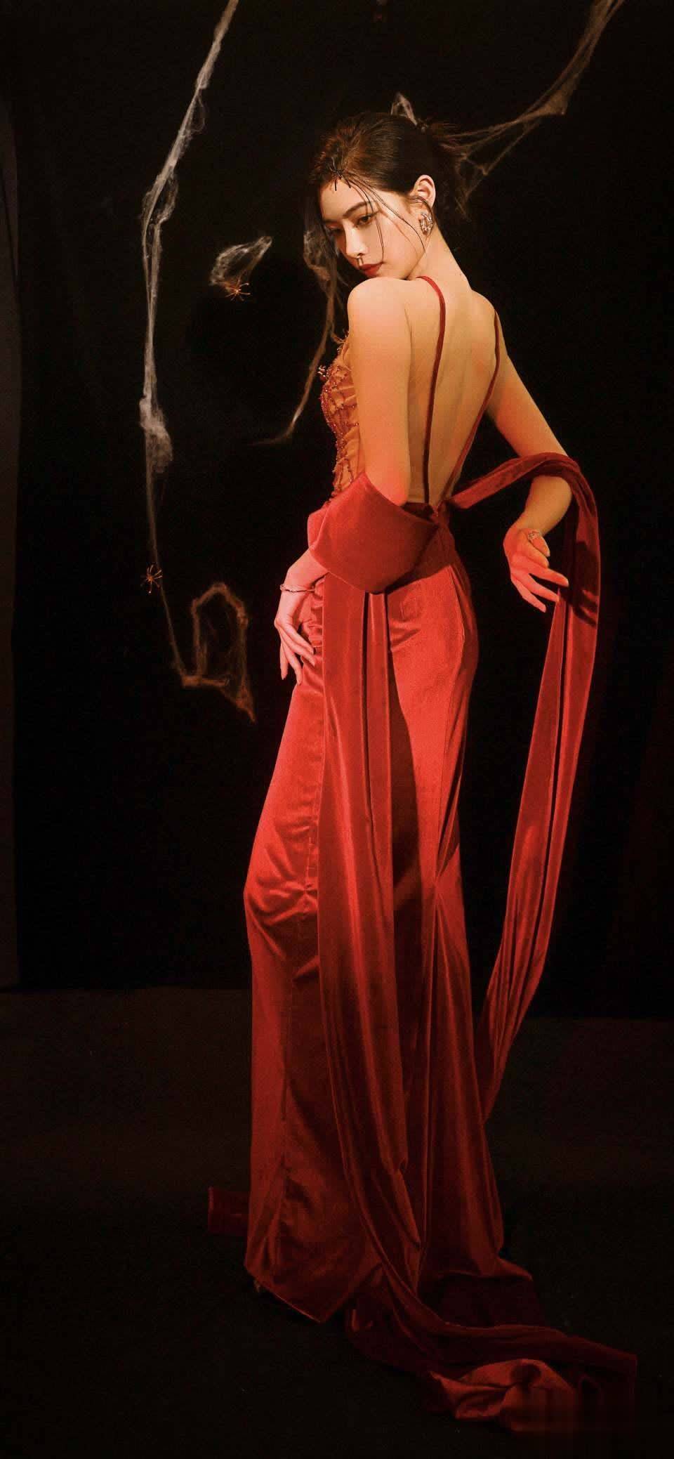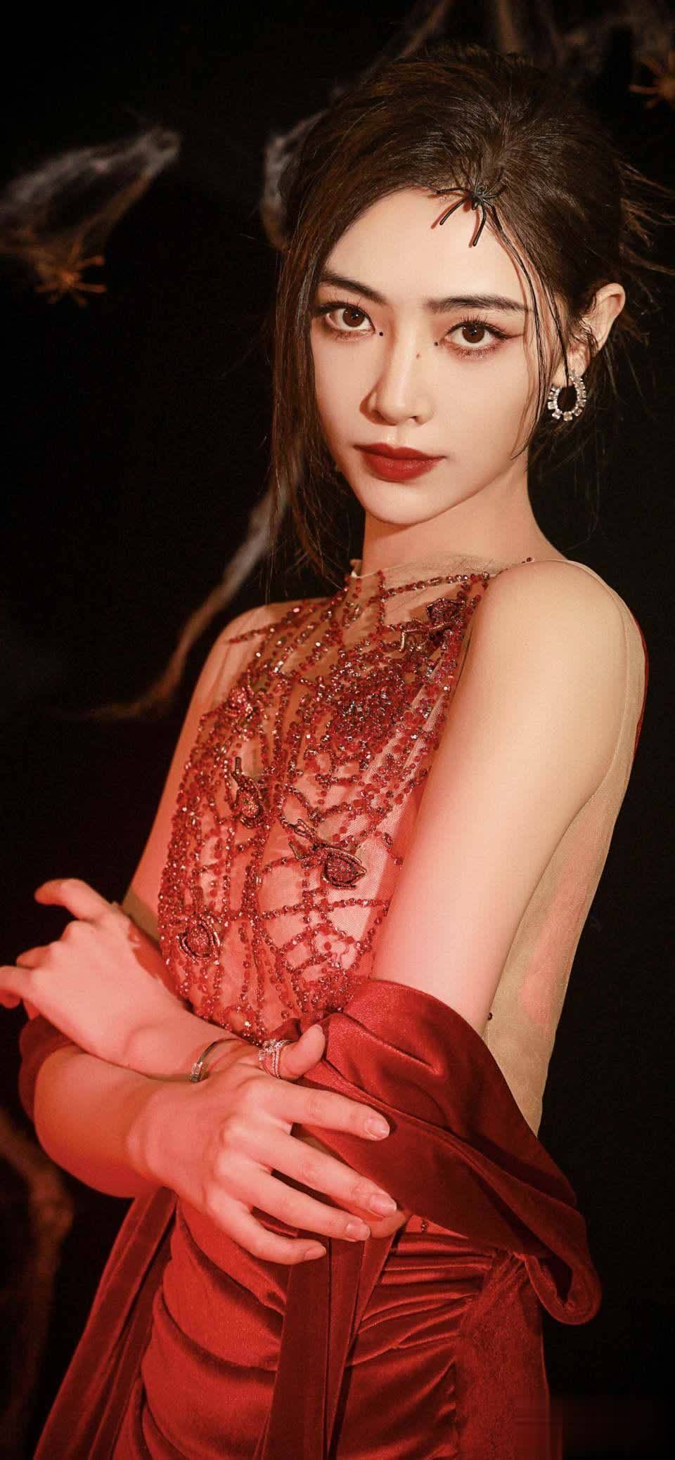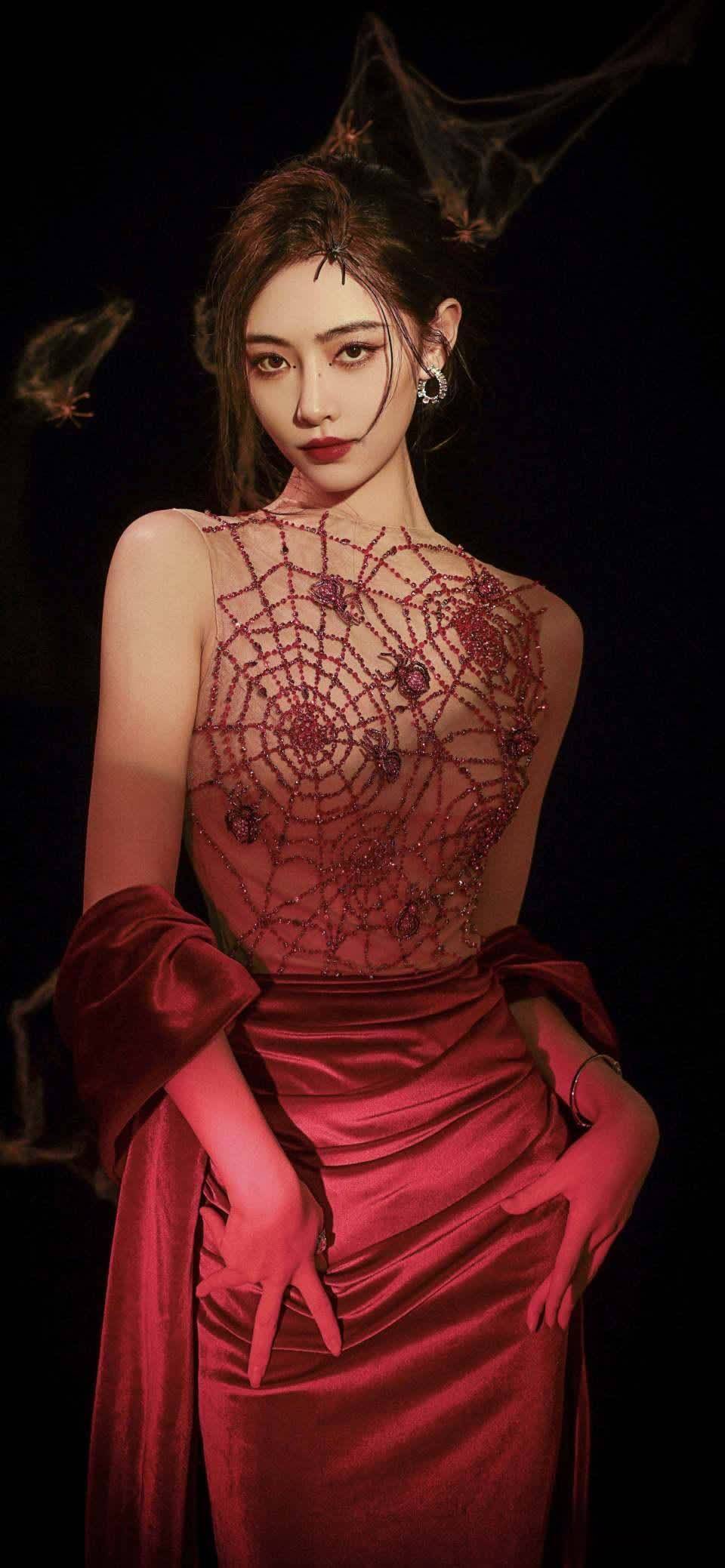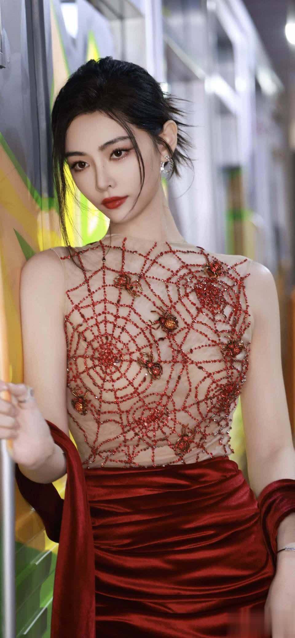 双手置于红色丝滑的裙摆处,身姿曼妙。礼服的质感在灯光下显得格外高级,红色的光泽流转,衬得她肌肤胜雪。上半身蛛网与蜘蛛的装饰,让她宛如 “蜘蛛女王”,既有着致命的吸引力,又带着独属于她的时尚态度,每一寸面料都像是为她的好身材量身定制,将曲线美展现得淋漓尽致。