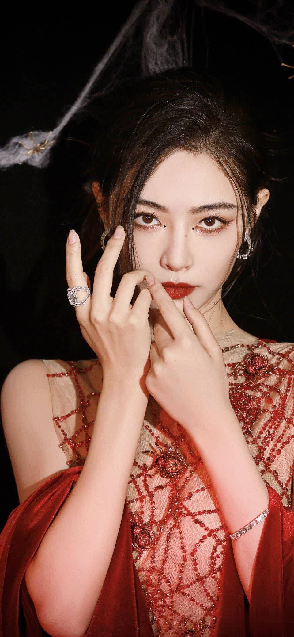 许佳琪身着带有蜘蛛元素的红色礼服,手指轻抬,那枚闪耀的戒指与礼服上的亮片相互辉映。她的妆容精致,眼尾的勾勒、红唇的点缀,都为整体造型增添了神秘魅惑感。这一抬手的姿态,既带着女性的柔美,又隐隐透出一股掌控全场的气场,仿佛是暗夜中悄然苏醒的女王,准备开启属于她的时尚盛宴。